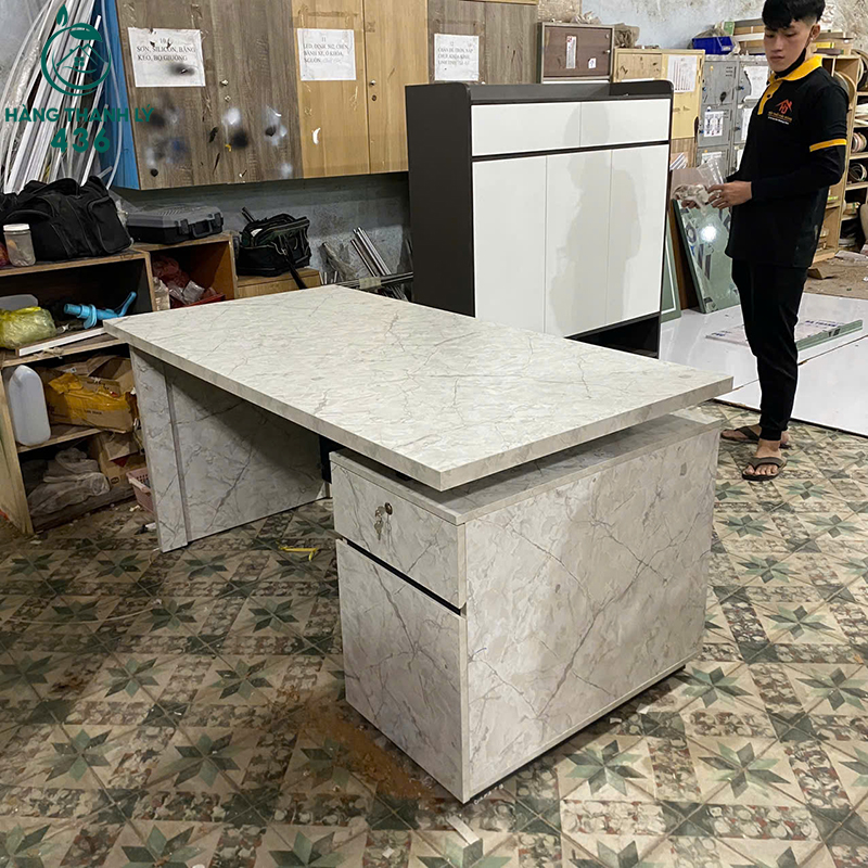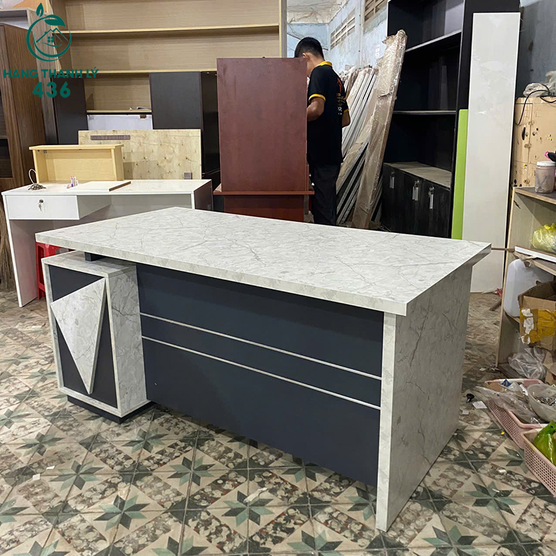 Mô Tả: Mẫu bàn giám đốc này sở hữu diện mạo cực kỳ đẳng cấp với mặt bàn rộng 1m6 phủ lớp vân đá trắng tinh tế, tạo điểm nhấn sang trọng cho không gian làm việc của lãnh đạo. Khung bàn và yếm bàn được làm từ gỗ công nghiệp màu xám đen chắc chắn, phối hợp hài hòa tạo nên tổng thể hiện đại, uy nghiêm. Sản phẩm được trang bị sẵn hộc tủ có ngăn kéo khóa đi kèm, giúp bạn lưu trữ hồ sơ và đồ dùng cá nhân một cách an toàn, gọn gàng. Với kích thước mặt bàn rộng rãi 1m6x80cm, bạn có thể thoải mái bố trí máy tính, tài liệu và các vật dụng trang trí mà không lo chật chội. Bề mặt bàn có khả năng chống trầy xước và chống thấm tốt, đảm bảo độ bền đẹp dài lâu.