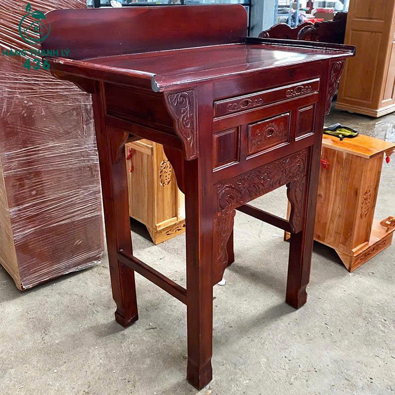 - Mô tả: Bàn thờ gia tiên gỗ tự nhiên, được làm từ gỗ chất lượng cao với màu sắc nâu đỏ, mang lại vẻ đẹp sang trọng và trang nghiêm. Bàn thờ có thiết kế đơn giản nhưng tinh xảo, với các chi tiết chạm khắc hoa văn đẹp mắt ở các chân và mặt bàn. Phía trên có phần tựa, giúp bảo vệ các vật phẩm thờ cúng, tạo sự an toàn khi sử dụng. Một ngăn kéo nhỏ phía trước giúp người dùng lưu trữ các vật dụng hoặc đồ thờ cúng. Với kiểu dáng nhỏ gọn và vững chắc, bàn thờ này phù hợp cho các không gian thờ cúng trong gia đình, tạo nên không gian thanh tịnh và tôn nghiêm. Sản phẩm là lựa chọn lý tưởng cho những ai tìm kiếm một chiếc bàn thờ gỗ đẹp, chất lượng với mức giá hợp lý.