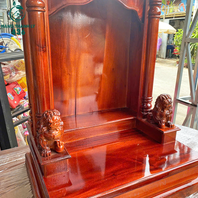 - Mô Tả: Bàn thờ Thần Tài – Ông Địa được chế tác từ gỗ tự nhiên với màu nâu đỏ bóng, nổi bật vân gỗ sắc nét mang lại vẻ sang trọng và trang nghiêm. Thiết kế hình chữ nhật đứng, phần mái uốn cong mềm mại, hai bên là hai trụ cột chạm khắc tinh tế, tạo điểm nhấn cổ điển. Phía trước có đôi linh vật kỳ lân ngồi canh giữ, thể hiện sự bảo hộ và vượng khí cho gia chủ. Kết cấu vững chắc với phần chân đế cao, mặt thờ rộng rãi, thích hợp đặt trong phòng khách, khu vực kinh doanh hoặc nơi trang trọng trong nhà. Bề mặt được phủ lớp sơn bóng giúp tăng độ bền, chống ẩm và dễ lau chùi.