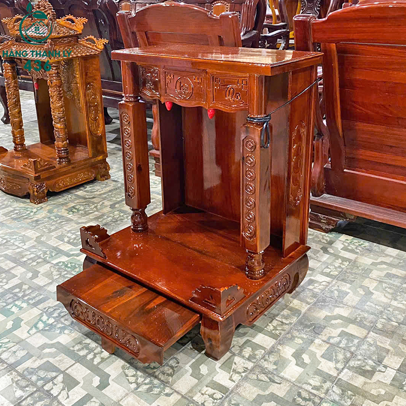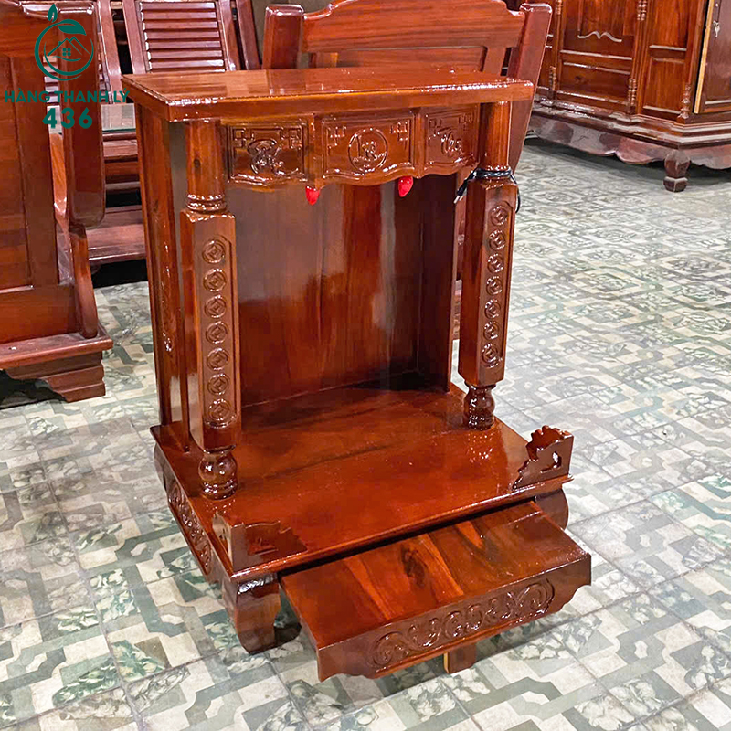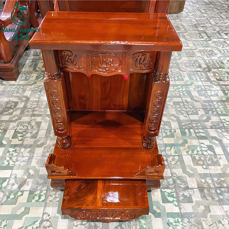 - Mô tả: Bàn thờ ông Địa gỗ tràm Phúc Lộc Thọ, được làm từ gỗ tự nhiên, với màu sắc nâu đỏ ấm áp và vân gỗ đẹp mắt. Bàn thờ có thiết kế cổ điển với các chi tiết chạm khắc tỉ mỉ hình Phúc, Lộc, Thọ ở phần mặt trước, mang lại sự may mắn và thịnh vượng cho gia chủ. Phía dưới có một ngăn kéo nhỏ để cất giữ các vật dụng thờ cúng hoặc đồ nhỏ cần bảo quản. Các cột trụ được chạm khắc tinh xảo, tạo thêm vẻ trang nghiêm và uy nghi cho không gian thờ cúng. Đèn đỏ trang trí tại các góc làm điểm nhấn nổi bật. Đây là sản phẩm lý tưởng cho không gian thờ cúng trong gia đình, mang đến không khí thanh tịnh, linh thiêng và đầy đủ tài lộc.