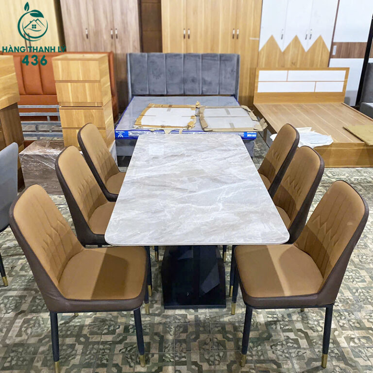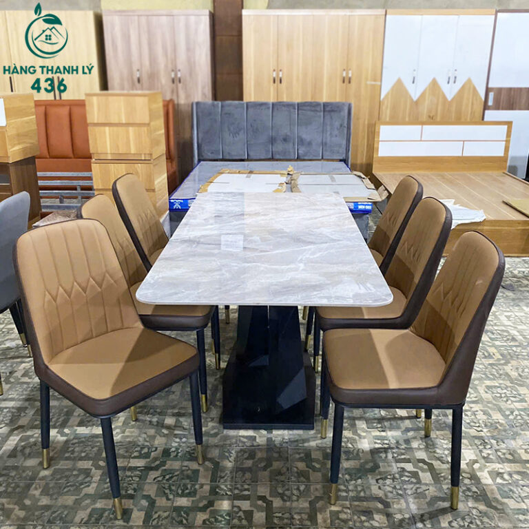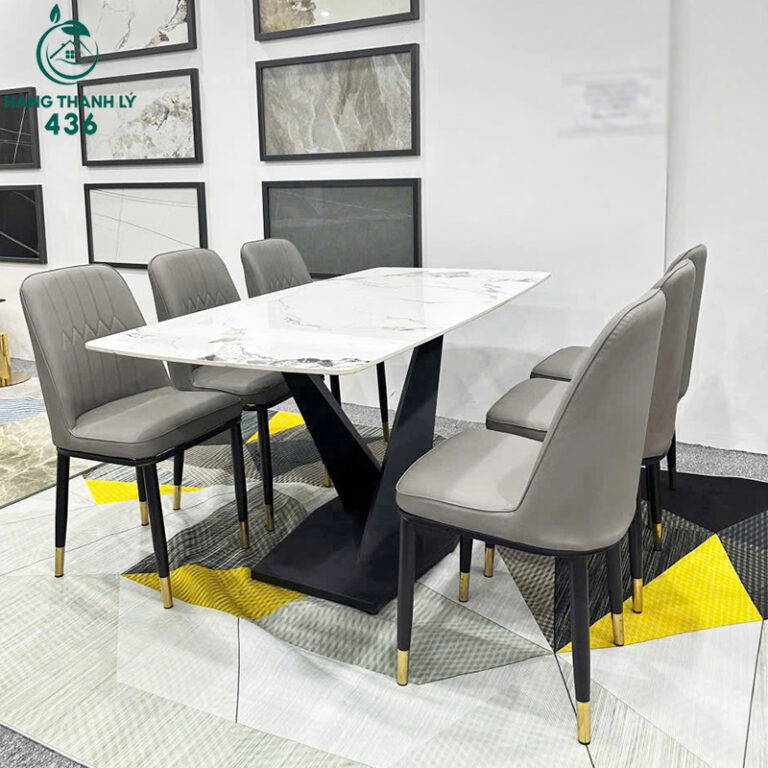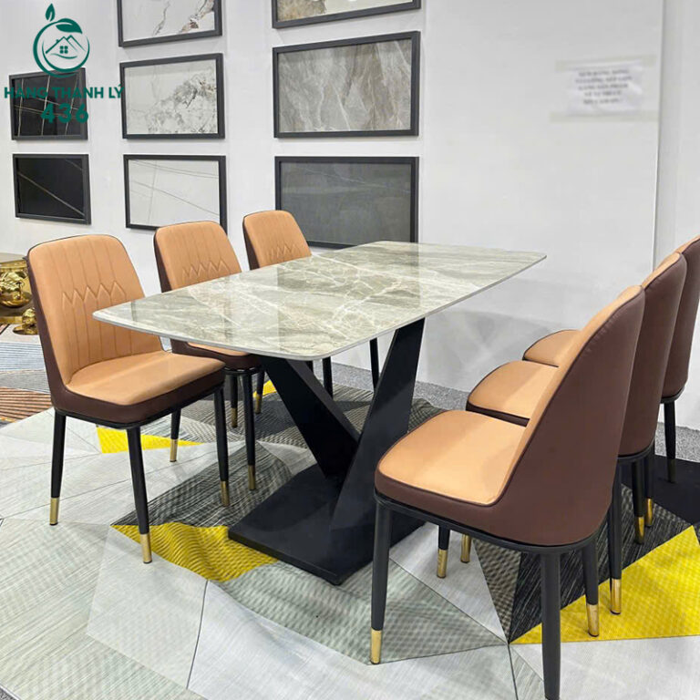 - Mô tả: Bộ bàn ăn 6 ghế gây ấn tượng với thiết kế hiện đại và thanh lịch, kết hợp hoàn hảo giữa mặt bàn đá vân tự nhiên sang trọng và chân bàn tạo hình chữ V độc đáo, vững chắc. Mặt bàn được bo góc nhẹ, đảm bảo an toàn khi sử dụng, đồng thời dễ vệ sinh và chịu lực tốt. Ghế ăn có tựa lưng cao, đường may tinh tế cùng phần đệm ngồi êm ái, mang lại cảm giác thoải mái cho người dùng trong các bữa ăn kéo dài. Kiểu dáng ghế uốn cong nhẹ ôm lưng, tạo sự hài hòa về thị giác và nâng cao tính thẩm mỹ tổng thể. Sản phẩm phù hợp với phòng ăn gia đình, không gian chung cư, nhà phố hoặc các căn hộ hiện đại, mang lại nét sang trọng và tiện nghi cho không gian sống.