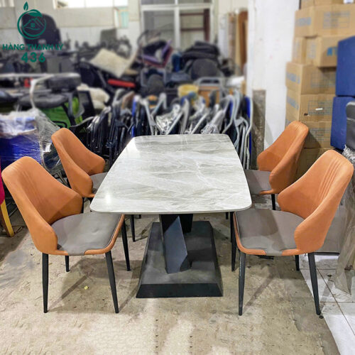 - Mô tả: Bộ bàn ăn với mặt bàn đá vân mây sang trọng, sáng bóng, mang đến cảm giác cao cấp và dễ dàng vệ sinh. Bàn được thiết kế chân đế sắt chắc chắn, đảm bảo độ ổn định cao. Đi kèm là 4 ghế bọc nhung mềm mại, phần tựa lưng và đệm ngồi êm ái, mang đến cảm giác thoải mái khi sử dụng lâu dài. Kiểu dáng hiện đại kết hợp màu sắc thanh lịch, phù hợp với nhiều phong cách bài trí phòng ăn gia đình hoặc nhà hàng.