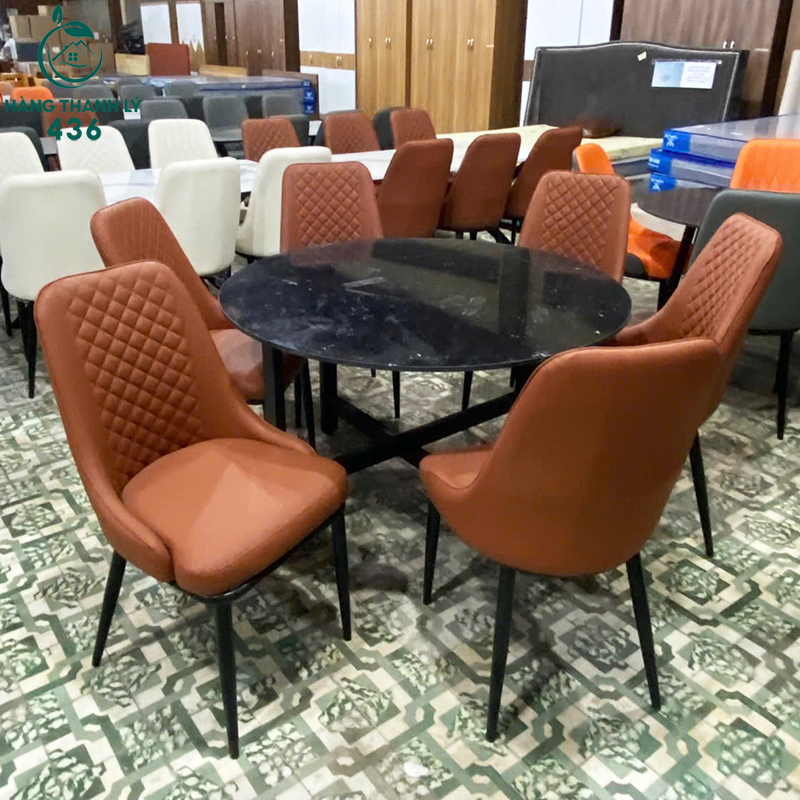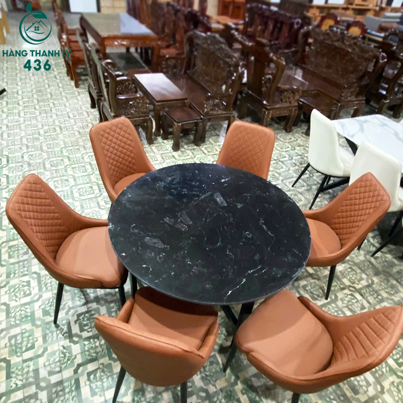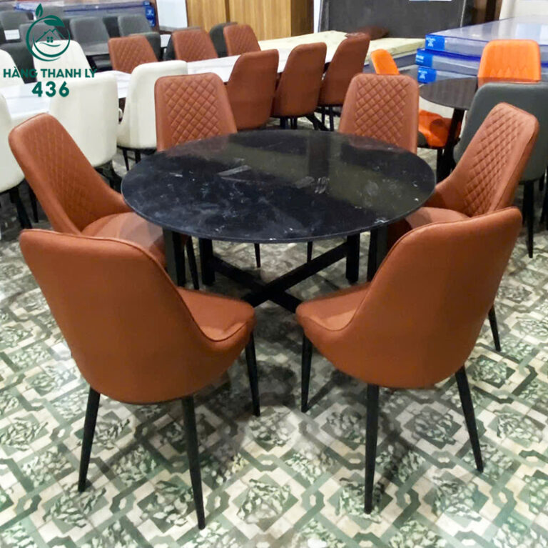 Mô Tả: Bộ bàn ghế ăn gồm 1 bàn tròn mặt đá và 6 ghế bọc da, thiết kế hiện đại, phù hợp nhiều không gian sinh hoạt. Mặt đá màu đen vân tự nhiên giúp bàn nhìn sang và dễ vệ sinh sau khi sử dụng. Ghế bọc da màu cam nâu, form ngồi chắc chắn, tựa lưng êm, tạo cảm giác thoải mái khi dùng bữa. Bộ bàn ghế ăn thanh lý còn sử dụng tốt, thích hợp cho gia đình đông người hoặc không gian ăn uống cần bố trí gọn gàng.