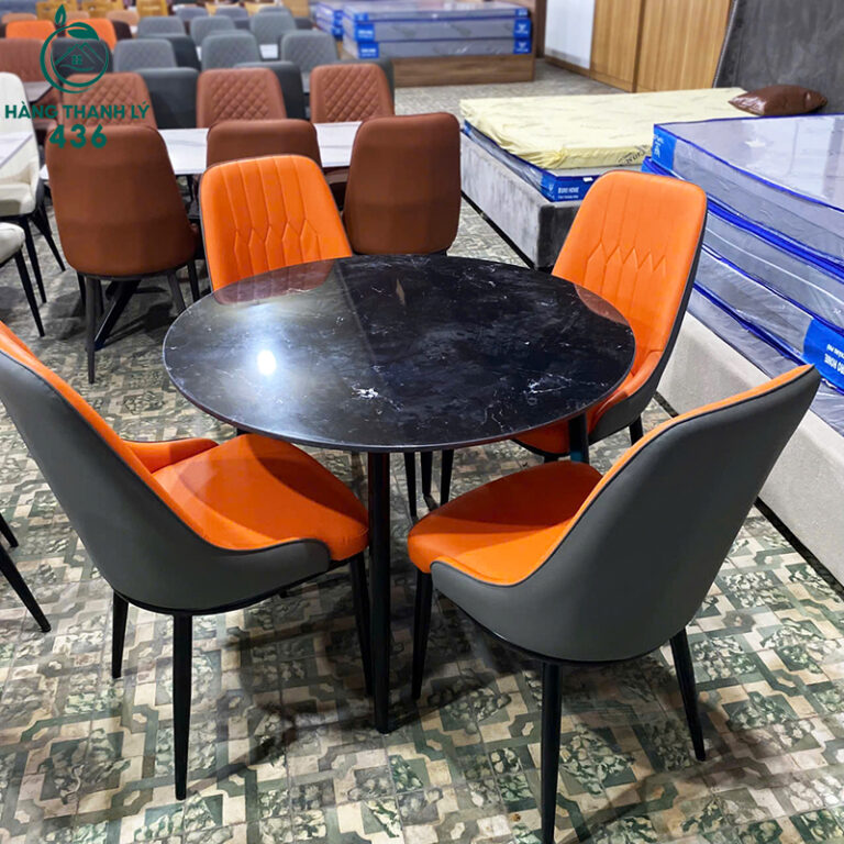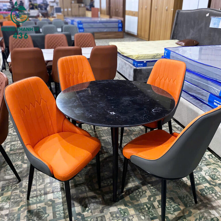 - Chất Liệu: Bàn mặt đá, ghế bọc da màu cam
