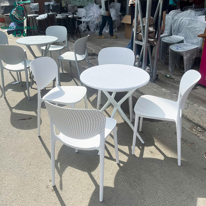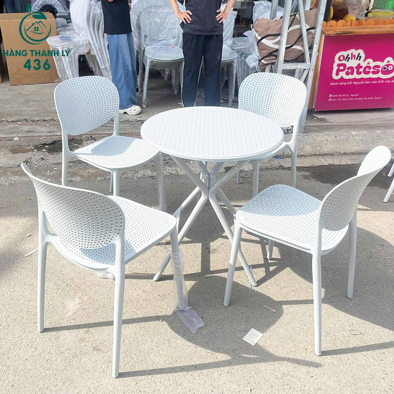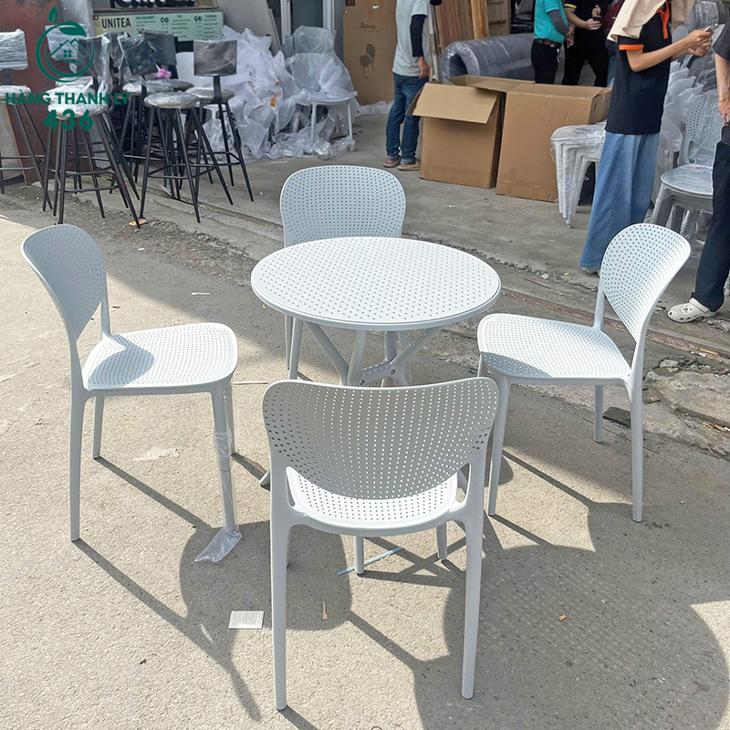 - Mô Tả: Bộ bàn ghế cafe có thiết kế hiện đại, nhỏ gọn và trẻ trung, gồm một bàn tròn và bốn ghế đồng bộ với tông màu trắng sáng tinh tế. Cả bàn và ghế đều được làm từ chất liệu nhựa đúc cao cấp, có khả năng chống thấm nước, chịu nắng mưa tốt, rất phù hợp cho không gian ngoài trời như ban công, sân vườn, quán cà phê hay trà sữa. Mặt bàn và phần lưng tựa, mặt ngồi của ghế được thiết kế dạng lưới thoáng khí, tạo sự dễ chịu khi sử dụng lâu. Khung chân bàn chắc chắn với kiểu chân bắt chéo độc đáo, tăng độ ổn định và thẩm mỹ. Với kiểu dáng tối giản nhưng vẫn nổi bật, bộ sản phẩm này không chỉ mang lại sự tiện dụng mà còn góp phần làm nổi bật không gian sử dụng nhờ sự thanh lịch và linh hoạt trong bố trí.