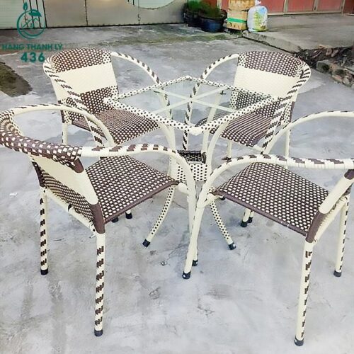 - Chất liệu: Bàn ghế nhựa giả mây, mặt bàn bằng kính