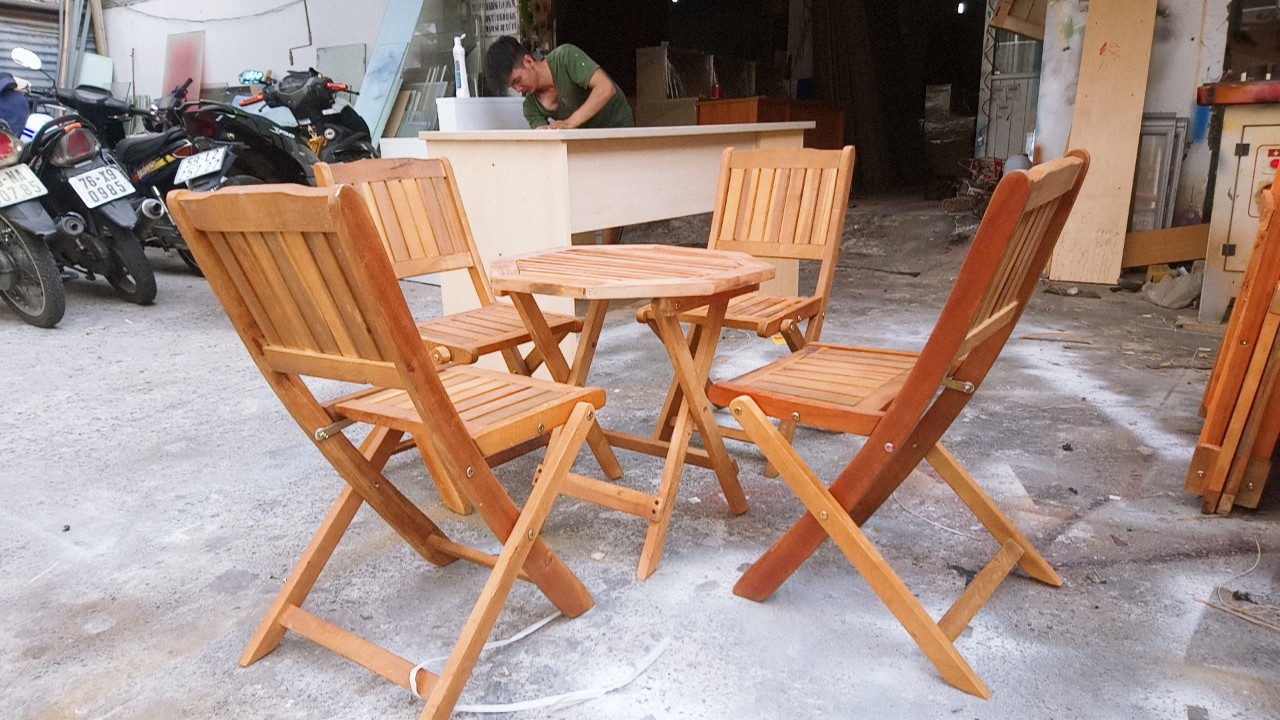 Bộ bàn ghế gỗ là một lựa chọn tuyệt vời cho không gian quán trà chanh, quán nước ngoài trời. Với thiết kế gọn nhẹ, bàn có thể xếp lại khi không sử dụng, giúp tiết kiệm diện tích. Bộ gồm 1 bàn và 4 ghế gỗ nhỏ, chắc chắn, mang đến cảm giác gần gũi và thân thiện cho khách hàng. Chất liệu gỗ tự nhiên được xử lý kỹ lưỡng, giúp bề mặt chống ẩm và chịu lực tốt, đảm bảo độ bền cao trong điều kiện sử dụng thường xuyên. Bộ bàn ghế này thích hợp với những quán có phong cách mộc mạc, giản dị nhưng vẫn mang đến vẻ đẹp tinh tế.