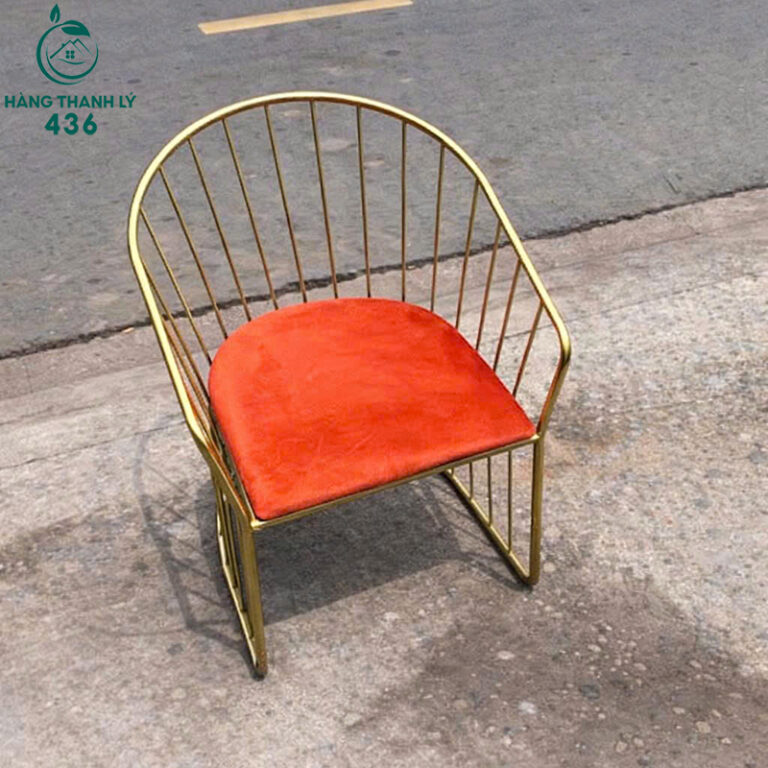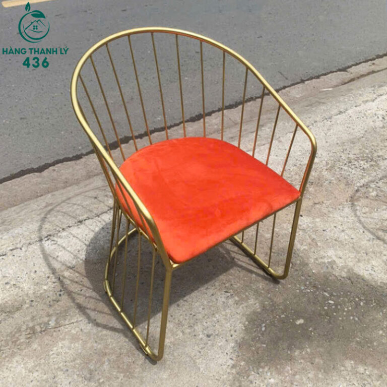 Mô Tả: Sản phẩm là mẫu ghế decor cao cấp với phần khung được làm từ sắt sơn tĩnh điện mạ vàng sáng bóng, đảm bảo tính thẩm mỹ và độ bền cực cao. Thiết kế ghế dạng nan chạy dọc ôm sát phần lưng giúp người ngồi có cảm giác thông thoáng và dễ chịu. Phần nệm ngồi được bọc vải nhung màu cam nổi bật, có độ đàn hồi tốt, mang lại sự êm ái khi sử dụng trong thời gian dài. Với kiểu dáng thanh mảnh nhưng chắc chắn, mẫu ghế này rất phù hợp để trang trí cho các không gian quán cafe theo phong cách sang trọng, hiện đại hoặc làm ghế trang điểm tại gia đình. Bề mặt khung sắt mịn màng, dễ dàng vệ sinh giúp sản phẩm luôn giữ được vẻ đẹp như mới.