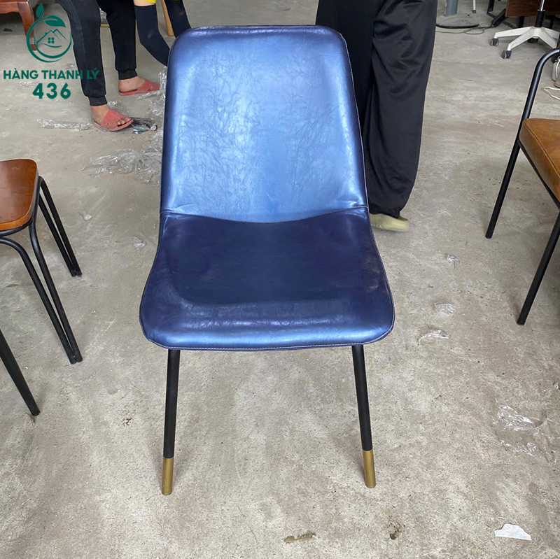 Mô Tả: Mẫu ghế này là sự lựa chọn hoàn hảo cho những không gian cần sự tinh tế và đẳng cấp như nhà hàng, quán cafe cao cấp hoặc làm ghế bàn ăn gia đình. Phần mặt ngồi và tựa lưng được bọc nệm da simili cao cấp màu xanh biển sâu, vừa mang lại cảm giác êm ái khi sử dụng vừa giúp việc vệ sinh trở nên đơn giản hơn. Điểm nhấn nổi bật nằm ở phần chân sắt sơn tĩnh điện đen chắc chắn, có bọc đồng ở phần đế chân tạo nên vẻ đẹp sang trọng và chống trầy xước sàn nhà hiệu quả. Với thiết kế không tay vịn gọn gàng, sản phẩm giúp tiết kiệm không gian trưng bày mà vẫn đảm bảo được sự thoải mái tối đa cho người ngồi.