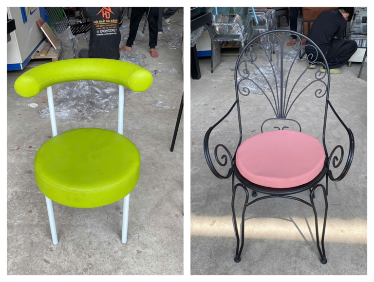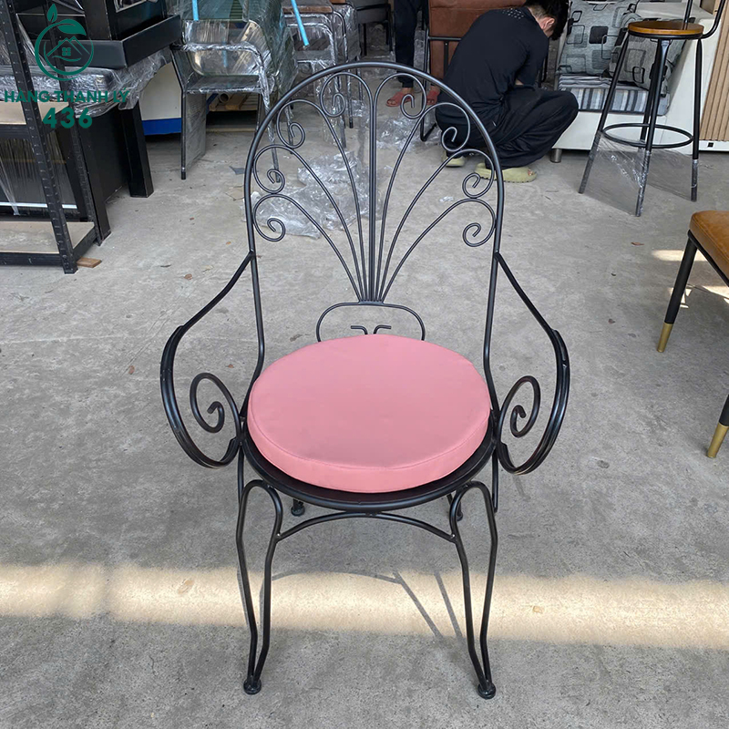 Mô Tả: Mẫu ghế cafe này sở hữu thiết kế sắt uốn nghệ thuật đầy ấn tượng, mang lại vẻ đẹp cổ điển và lãng mạn cho không gian quán cafe sân vườn, trà sữa hoặc studio chụp ảnh. Khung ghế được làm từ sắt tròn sơn tĩnh điện đen nhám, uốn cong tạo hình hoa văn ở phần tựa lưng và tay vịn vô cùng tỉ mỉ, đảm bảo độ vững chãi và khả năng chống chịu thời tiết tốt. Phần mặt ngồi trang bị nệm tròn bọc da simili màu hồng pastel nhẹ nhàng, tạo cảm giác êm ái và điểm nhấn màu sắc nổi bật. Với kiểu dáng thanh lịch và các chi tiết uốn lượn mềm mại, sản phẩm không chỉ là món đồ nội thất bền bỉ mà còn là điểm nhấn thẩm mỹ thu hút mọi ánh nhìn.
