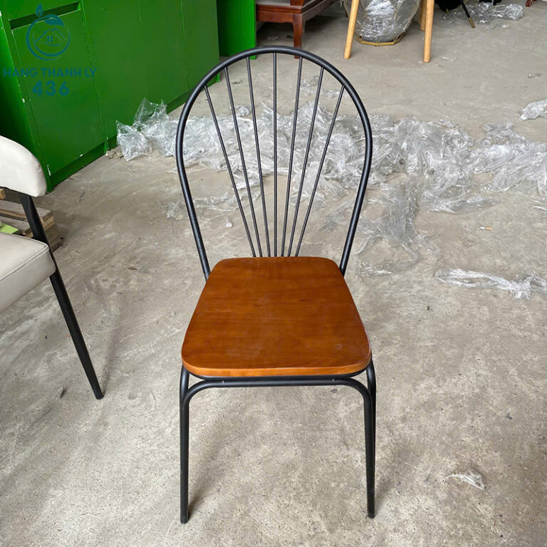 - Mô tả: Mẫu ghế cafe này là sự lựa chọn hoàn hảo cho những không gian quán theo phong cách hiện đại hoặc vintage. Sản phẩm gây ấn tượng với phần tựa lưng hình nan quạt thanh mảnh nhưng cực kỳ chắc chắn, tạo cảm giác thông thoáng và dễ chịu khi ngồi. Khung chân sắt được sơn tĩnh điện bền bỉ, chống gỉ sét và chịu lực tốt, đảm bảo độ bền cao trong môi trường kinh doanh dịch vụ. Mặt ghế bằng gỗ tự nhiên được xử lý láng mịn, giữ màu sắc vàng nâu ấm áp, vừa dễ dàng vệ sinh vừa mang lại vẻ đẹp sang trọng cho không gian quán.