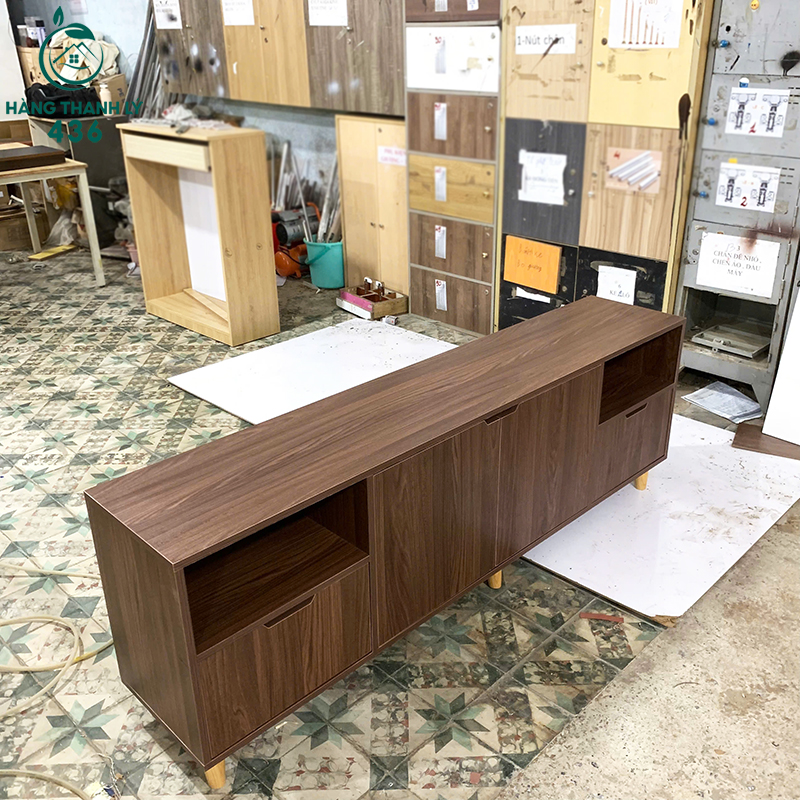 Mô Tả: Đây là mẫu kệ tivi gỗ công nghiệp với thiết kế 2 cánh mở đối xứng, mang lại vẻ đẹp cân đối và hiện đại cho không gian phòng khách của bạn. Kệ được làm từ gỗ công nghiệp cao cấp, bề mặt phủ Melamine màu nâu gỗ đậm với vân sọc ngang tinh tế, tạo cảm giác ấm cúng và sang trọng. Hệ thống 2 hộc kéo lớn ở hai bên và 2 cánh cửa tủ mở ở giữa cung cấp không gian lưu trữ cực kỳ rộng rãi, giúp bạn dễ dàng sắp xếp gọn gàng các thiết bị giải trí, đầu đĩa, sách báo hay các vật dụng gia đình khác. Thiết kế tủ bệt vững chãi, hoặc bạn có thể tùy chọn lắp thêm chân gỗ để tạo độ thoáng cho gầm tủ.