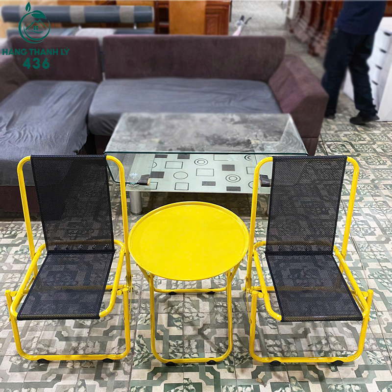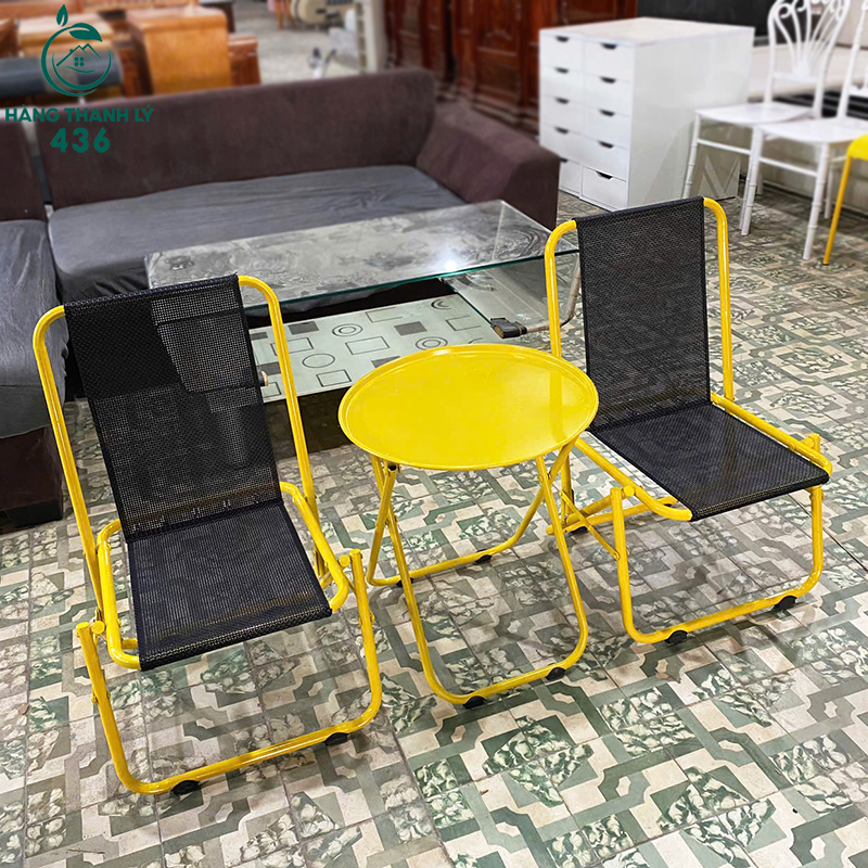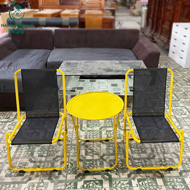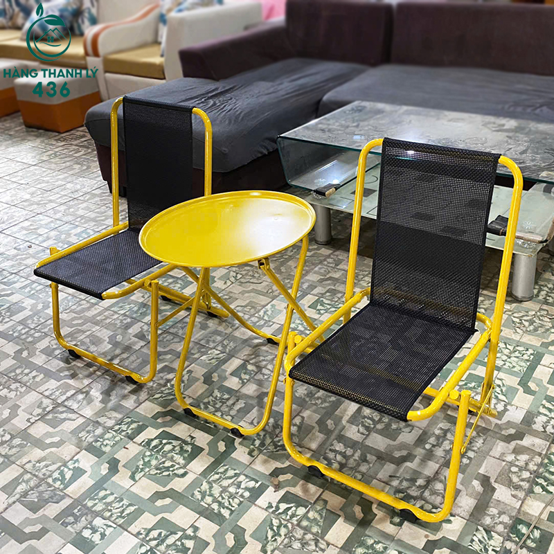 Mẫu bàn ghế cafe quán cóc màu vàng lưng lưới, bàn tròn gấp gọn