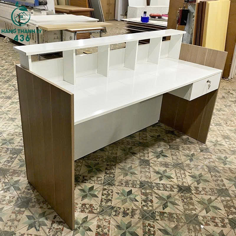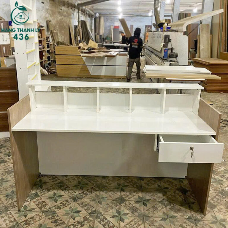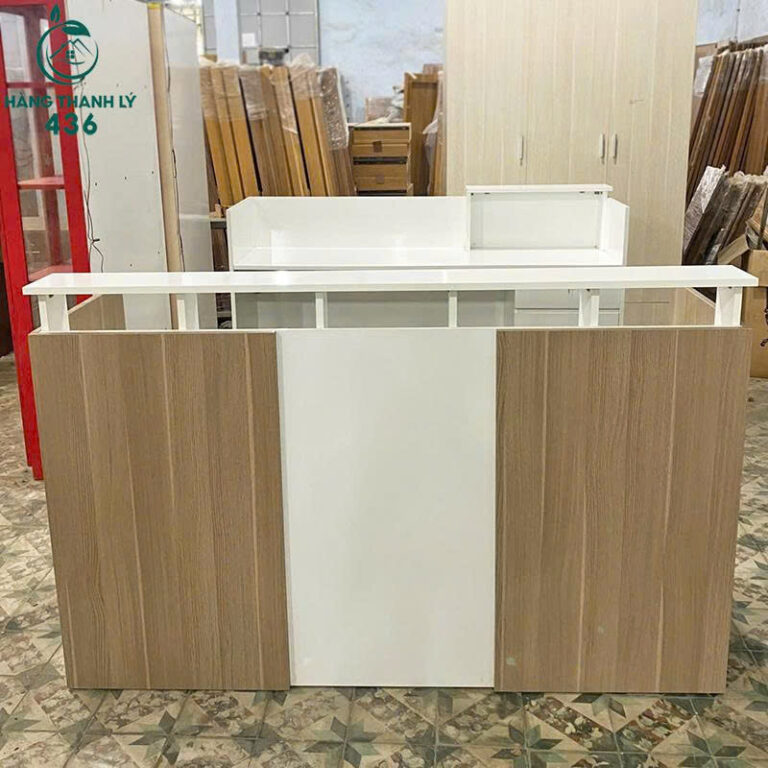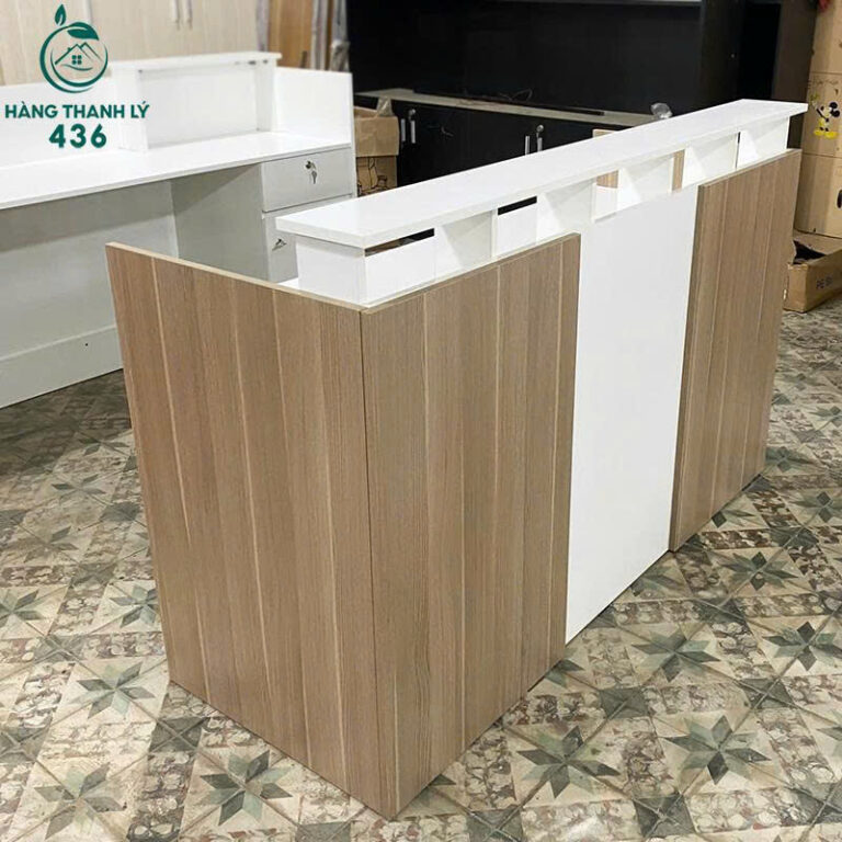 - Mô Tả: Tạo một khu vực tiếp đón khách hàng chuyên nghiệp và rộng rãi với mẫu quầy lễ tân chữ L này. Thiết kế vuông góc giúp tận dụng tối đa không gian, phù hợp cho nhiều loại hình kinh doanh. Quầy có sự kết hợp hài hòa giữa màu vân gỗ sáng và màu trắng. Mặt bàn làm việc bên trong rộng rãi, phía trên có các ngăn kệ nhỏ để sắp xếp vật dụng. Quầy còn được trang bị một hộc kéo có khóa để cất giữ những vật dụng quan trọng. Dù là hàng thanh lý nhưng quầy có ngoại hình như mới, kết cấu vững chắc.