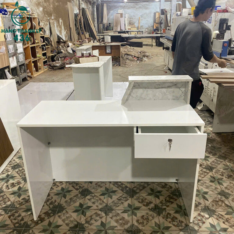 Mô Tả: Mẫu quầy lễ tân này mang phong cách thanh lịch với tông màu trắng chủ đạo phối cùng mảng vân đá tinh tế, phù hợp cho các spa, tiệm nail hoặc cửa hàng thời trang. Sản phẩm được làm từ gỗ công nghiệp cao cấp, bề mặt phủ Melamine bóng mịn giúp chống trầy xước và dễ dàng lau chùi. Thiết kế quầy bao gồm một bục kệ phía trên để khách hàng ký giấy tờ và một mặt bàn rộng rãi phía trong cho nhân viên làm việc. Đặc biệt, quầy tích hợp sẵn ngăn kéo có khóa an toàn, giúp bạn lưu trữ tiền bạc và hóa đơn quan trọng một cách kín đáo. Với kiểu dáng gọn gàng và ngoại hình còn rất mới, đây là giải pháp tối ưu để nâng cấp sảnh chờ chuyên nghiệp hơn mà vẫn tiết kiệm chi phí.