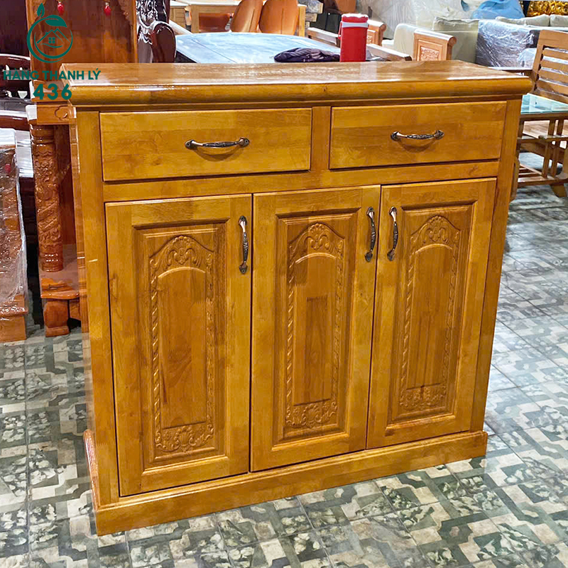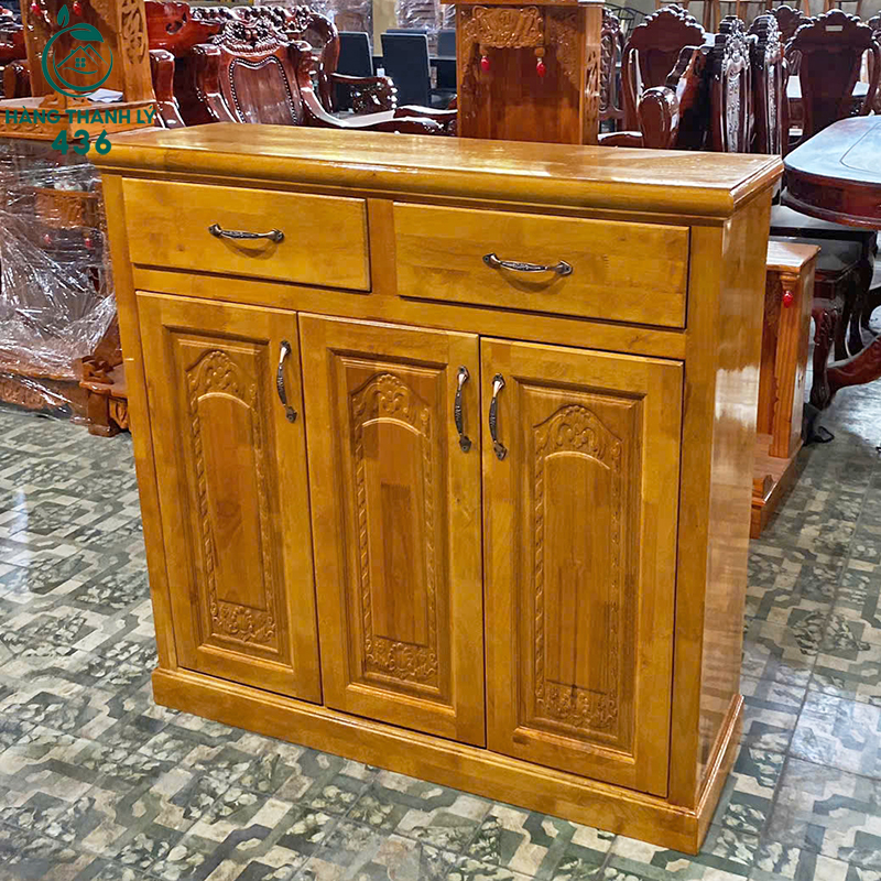 - Mô Tả: Tủ giày gỗ được thiết kế với phong cách cổ điển, sử dụng chất liệu gỗ tự nhiên chắc chắn, phủ lớp sơn bóng mịn màu nâu vàng nổi bật, tạo cảm giác ấm cúng và sang trọng cho không gian. Mặt tủ phẳng rộng có thể tận dụng để trưng bày hoặc đặt các vật dụng trang trí. Phía trên gồm hai ngăn kéo nhỏ tiện lợi để cất giữ đồ dùng cá nhân hoặc phụ kiện nhỏ. Bên dưới là ba cánh tủ mở ra không gian lưu trữ rộng rãi với nhiều tầng kệ, giúp tối ưu hóa công năng sử dụng. Các chi tiết chạm khắc nhẹ ở mặt cánh tủ tăng tính thẩm mỹ, tạo điểm nhấn cho sản phẩm.