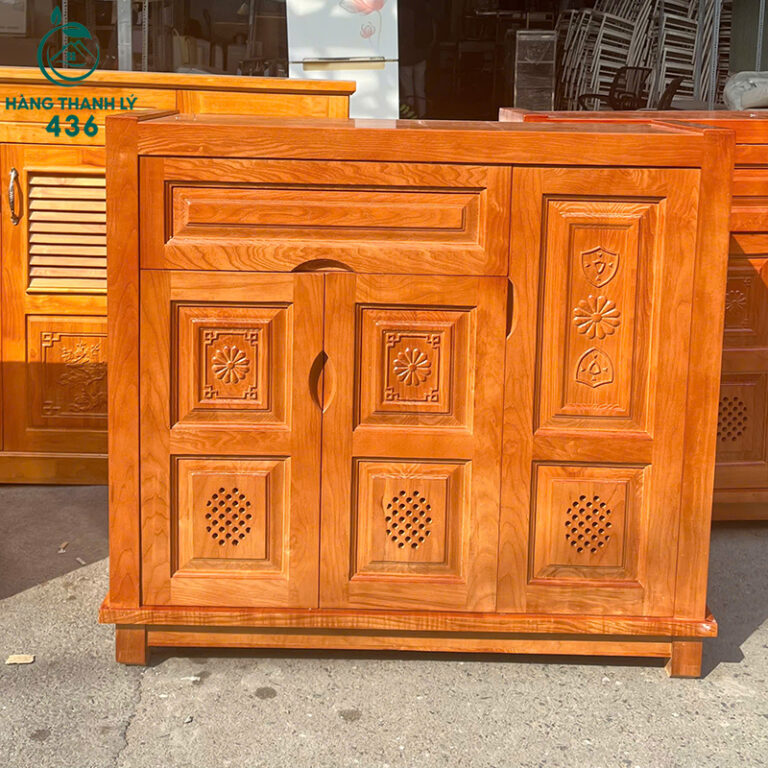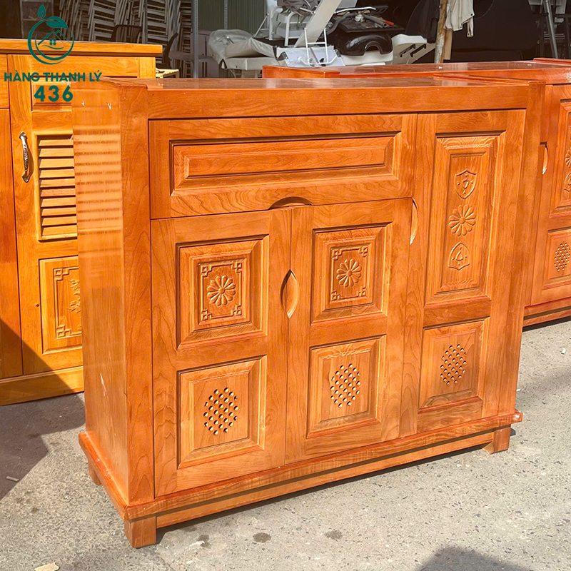 - Mô Tả: Chiếc tủ giày dép này là giải pháp hoàn hảo để giữ khu vực sảnh hoặc cửa ra vào nhà bạn luôn gọn gàng và sạch sẽ. Tủ được làm từ gỗ tự nhiên, có màu vàng sáng ấm áp và các chi tiết chạm khắc hoa văn tinh tế, làm tăng tính thẩm mỹ cho ngôi nhà. Thiết kế ba cánh mở với các lỗ thông hơi dạng lưới giúp giày dép bên trong luôn khô ráo, tránh được mùi hôi và ẩm mốc. Ngăn kéo lớn phía trên rất tiện dụng để bạn cất giữ chìa khóa, dụng cụ đánh giày hoặc các vật dụng nhỏ khác. Mua tủ gỗ tự nhiên cũ giúp bạn có món đồ bền đẹp, sử dụng lâu dài với chi phí hợp lý.