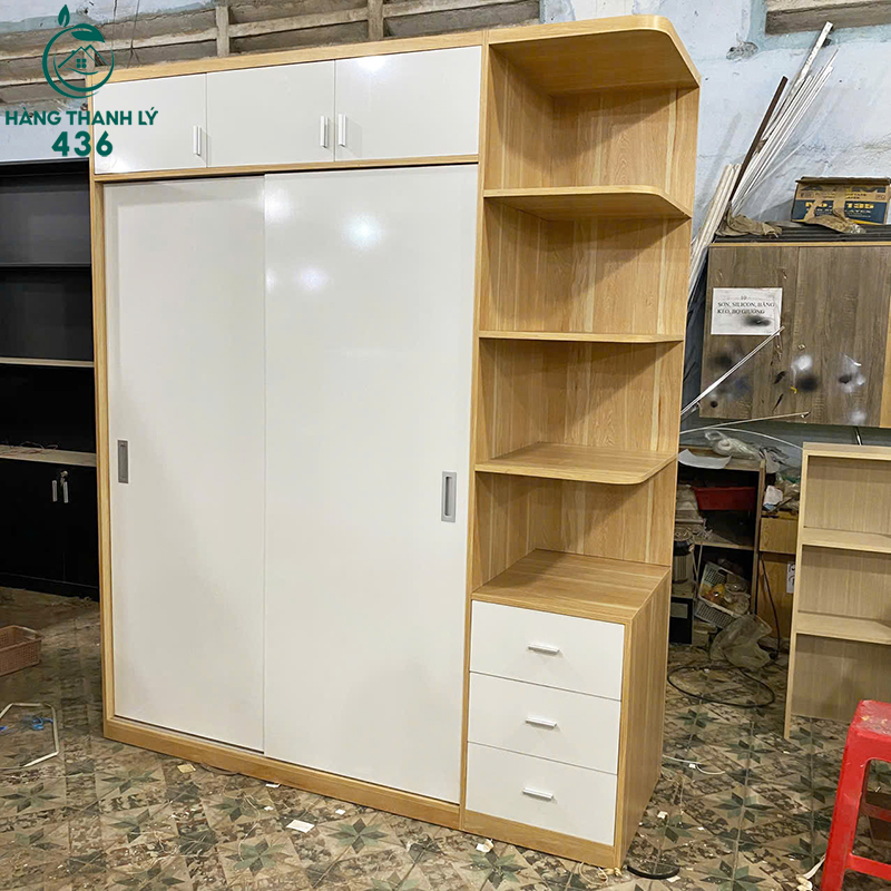 - Mô Tả: Chiếc tủ quần áo cửa lùa này là một thiết kế thông minh, giải quyết vấn đề không gian cho phòng ngủ hiện đại. Cánh cửa lùa (trượt) giúp bạn mở tủ mà không tốn diện tích ra vào, rất phù hợp cho những căn phòng hẹp. Điểm đặc biệt là tủ tích hợp kệ trưng bày mở ở bên hông và 3 hộc kéo riêng biệt, giúp bạn lưu trữ đồ cá nhân, phụ kiện hoặc sách vở một cách linh hoạt. Tủ có ngăn tủ trên cao giúp tận dụng tối đa không gian cất giữ chăn màn, đồ ít dùng.