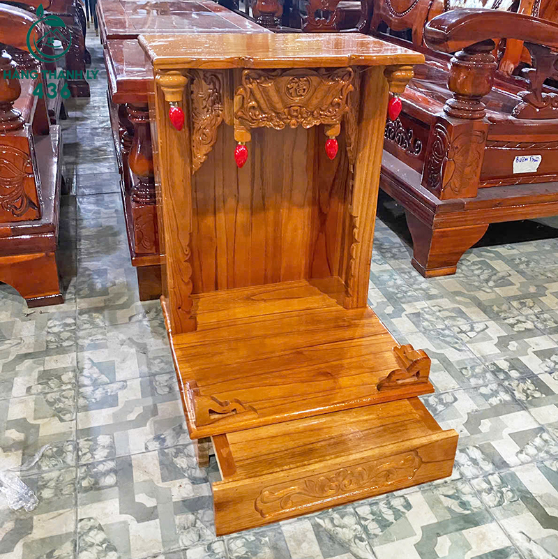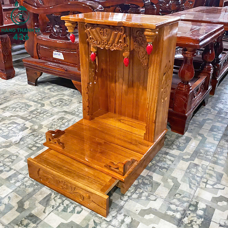 - Mô Tả: Bàn thờ thần tài gỗ mang sắc nâu vàng ấm áp, được chế tác từ gỗ tự nhiên chắc chắn, bền bỉ và sang trọng. Thiết kế nhỏ gọn, phù hợp đặt trong nhiều không gian như phòng khách hoặc góc thờ tại gia đình, vừa đảm bảo sự trang nghiêm vừa tiết kiệm diện tích. Bàn thờ có các chi tiết chạm khắc tinh xảo ở phần mái và thân, tạo nên vẻ đẹp truyền thống đậm nét văn hóa Á Đông. Bề mặt gỗ được đánh bóng kỹ càng, giúp tăng độ sáng và hạn chế trầy xước, đồng thời dễ dàng vệ sinh. Sản phẩm còn có tích hợp 4 bóng đèn màu đỏ nổi bật giúp không gian thờ cúng của gia chủ trở nên ấm cúng hơn.