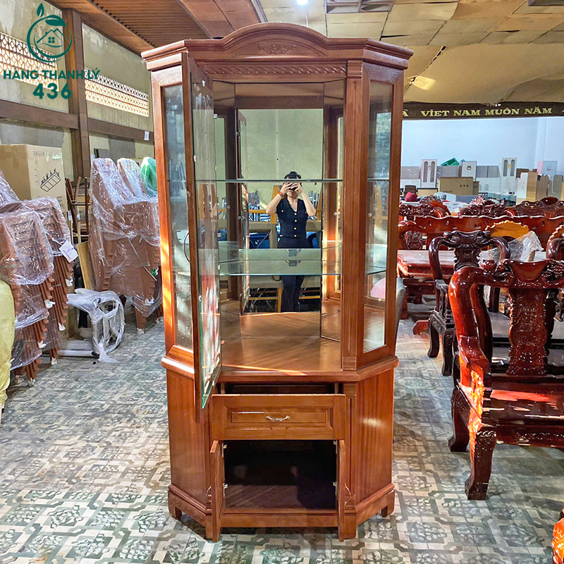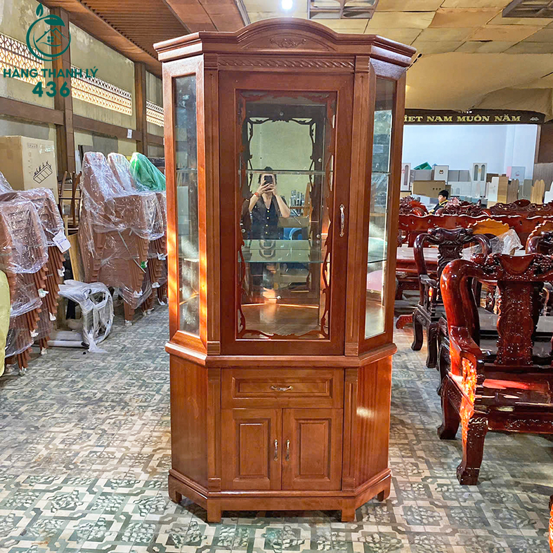 - Mô Tả: Tủ trưng bày góc gỗ tự nhiên là sản phẩm nội thất cao cấp, được thiết kế tinh tế với tông màu nâu cánh gián sang trọng, mang đậm nét truyền thống. Tủ có hình dáng lục giác đặc trưng, giúp tận dụng tối đa không gian góc, phù hợp đặt tại phòng khách hoặc phòng trưng bày. Phần thân trên được lắp kính cường lực trong suốt xung quanh, kết hợp cùng kệ kính bên trong, làm nổi bật các vật phẩm trưng bày như tượng, rượu, đồ lưu niệm hay ly tách cao cấp. Phía dưới là hệ tủ kín gồm một ngăn kéo nhỏ và hai cánh tủ, rất tiện lợi cho việc cất giữ đồ dùng. Với chất liệu gỗ tự nhiên được xử lý kỹ lưỡng và các chi tiết chạm khắc nhẹ nhàng, tủ không chỉ bền bỉ theo thời gian mà còn góp phần tôn lên vẻ đẹp trang nhã cho không gian sống.
