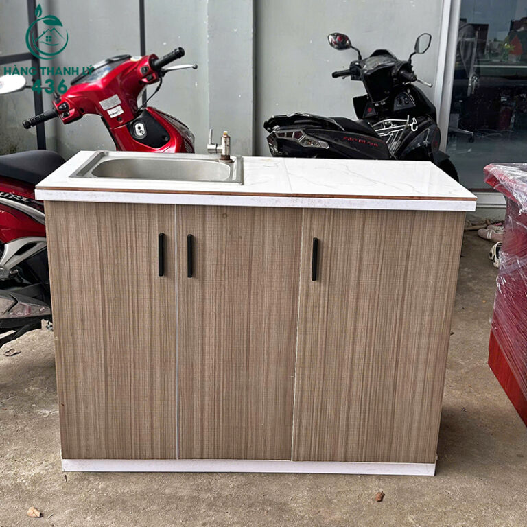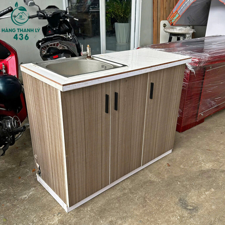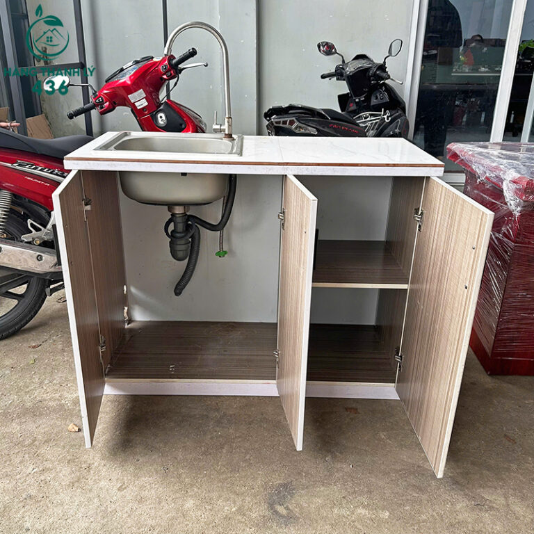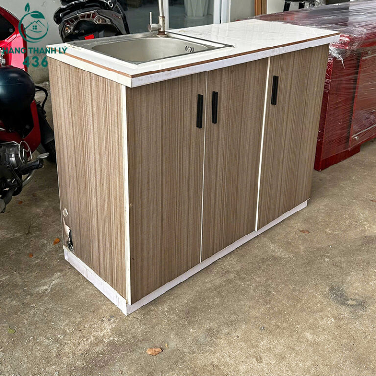 - Mô Tả: Đây là bộ tủ bồn rửa cũ thiết kế đứng độc lập, vô cùng linh hoạt khi lắp đặt tại bếp. Tủ nổi bật với vân gỗ nâu hiện đại kết hợp cùng mặt bàn màu trắng, tạo nên vẻ ngoài cao cấp. Tủ được tích hợp bồn rửa inox tiêu chuẩn và vòi nước cổ cao tiện lợi. Bên dưới, ba cánh tủ mở lớn cung cấp không gian khô ráo để lưu trữ dụng cụ và hóa chất.