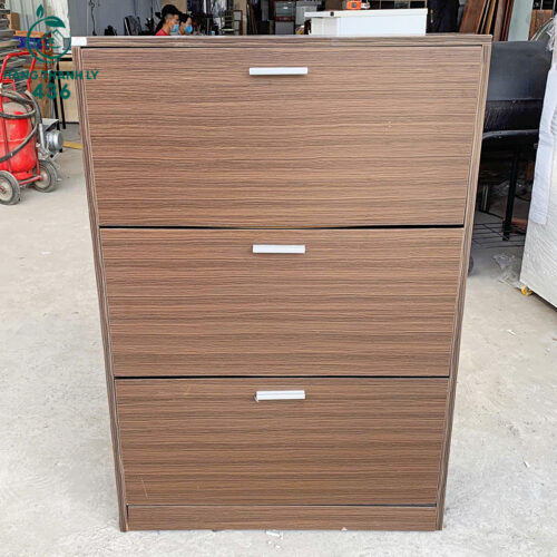 - Mô tả: Tủ giày thiết kế 3 ngăn dạng bật gập giúp tiết kiệm không gian, dễ thao tác khi sử dụng. Mỗi tầng có thể chứa từ 2-4 đôi tùy cỡ giày, phù hợp với các gia đình nhỏ hoặc phòng trọ. Tông màu gỗ nâu vân ngang hiện đại, tay nắm kim loại sáng màu tạo điểm nhấn. Có thể để trước cửa nhà, trong phòng ngủ hay hành lang đều tiện dụng.