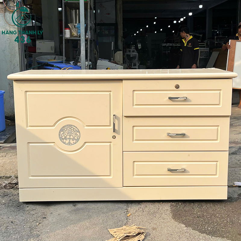 - Mô Tả: Mẫu tủ này có thiết kế gọn gàng, màu kem trung tính dễ phối không gian. Cánh tủ bên trái dập nổi hình tròn tạo điểm nhấn, bên phải là 3 ngăn kéo – ngăn trên có khóa bảo mật, hai ngăn dưới rộng rãi để hồ sơ, dụng cụ hoặc đồ nghề. Mặt tủ phẳng, có thể tận dụng làm bàn phụ. Khung sắt chắc chắn, chịu lực tốt, phù hợp cho văn phòng, tiệm sửa chữa, hoặc xưởng sản xuất.