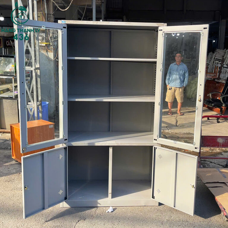 - Mô Tả: Chiếc tủ hồ sơ sắt này có thiết kế đứng cao, chia nhiều kệ bên trong nên rất tiện cho việc sắp xếp tài liệu. Phía trên là hai cánh cửa kính giúp dễ quan sát hồ sơ, sách hoặc đồ dùng mà không cần mở tủ. Phía dưới là hai cánh cửa sắt kín, phù hợp để những vật dụng cần sự riêng tư hoặc đồ ít dùng. Tủ được làm từ sắt sơn tĩnh điện nên khá bền, chịu lực tốt và hạn chế gỉ sét. Các cánh tủ đóng mở ổn, kệ trong rộng rãi, chỉ cần lau nhẹ là có thể dùng ngay.