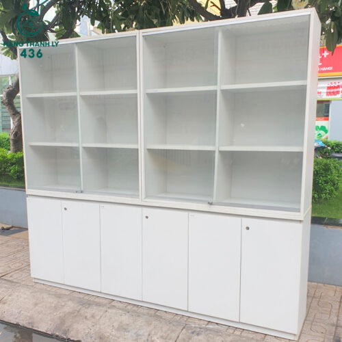 - Mô tả: Tủ kệ trưng bày cũ nhiều ngăn có diện tích lớn phù hợp với không gian lớn. Tủ có nhiều ngăn kệ tiện dụng để tối ưu hóa không gian trưng bày hay cũng có thể dùng để lưu trữ hồ sơ. Đặc biệt phần dưới tủ có trăng bị sẵn dãy hộc tủ lớn có cửa gỗ. Thiết kế hiện đại màu trắng phù hợp với nhiều không gian trưng bày. Tủ có 4 cửa kính lùa, mang đến một vẻ ngoài trang nhã và tinh tế. Sản phẩm được chế tác từ chất liệu gỗ công nghiệp bền đẹp trong thời gian sử dụng.