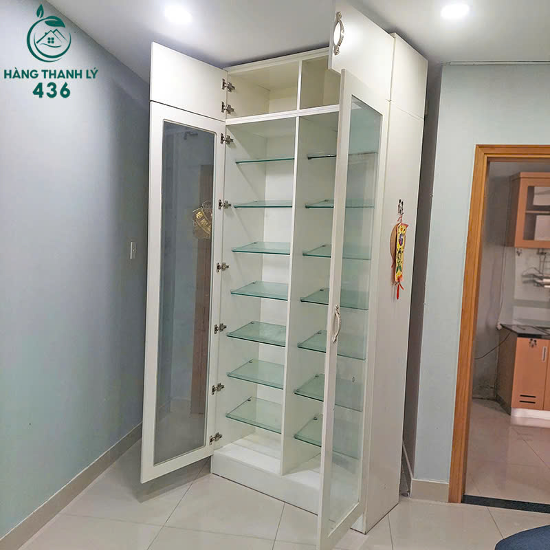 - Mô Tả: Tủ có thiết kế dạng hiện đại, bao gồm hai cánh cửa kính lớn trong suốt và nhiều tầng kệ bằng kính chịu lực bên trong, giúp tối đa hóa hóa không gian trưng bày và tạo hiệu ứng thị giác rộng rãi. Phía trên tủ còn có một ngăn chứa đặc biệt với cánh cửa đặc biệt, cung cấp thêm không gian lưu trữ kín. Đây là đơn lựa chọn lý tưởng cho phòng khách gia đình, cũng như các cửa hàng, spa hoặc văn phòng.