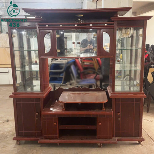 - Mô tả: Tủ trưng bày gỗ cũ kết hợp kính, thiết kế sang trọng với không gian chứa đồ rộng rãi. Hai bên là ngăn kính trong suốt giúp trưng bày đồ vật gọn gàng, dễ nhìn. Chính giữa có gương lớn tạo cảm giác không gian thoáng đãng hơn. Phần dưới tủ có nhiều ngăn kéo tiện lợi để đựng vật dụng cá nhân. Chất liệu gỗ chắc chắn, bề mặt sơn bóng đẹp mắt.