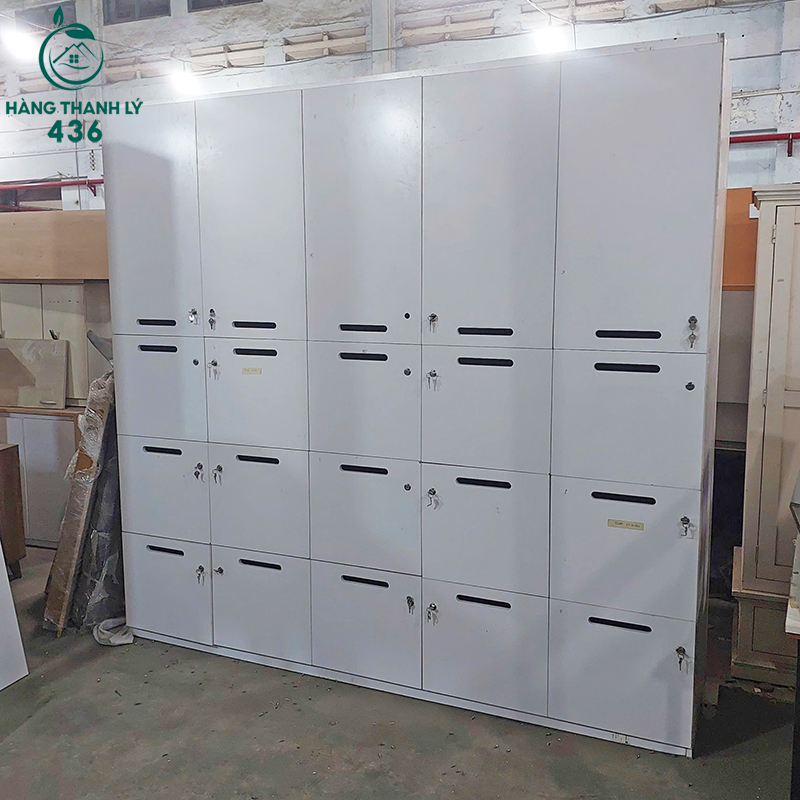 - Mô Tả: Tủ locker này có thiết kế dạng hình hộp chữ nhật lớn, chia thành nhiều ngăn nhỏ đều nhau, tổng cộng 20 khoang với 4 hàng và 5 cột, mỗi ngăn đều riêng biệt và khe thông gió dạng ngang phía trước. Sản phẩm được làm từ chất liệu gỗ sơn màu trắng, giúp tăng độ bền và dễ vệ sinh. Tủ có kiểu dáng vuông vức, chắc chắn, phù hợp sử dụng trong các môi trường công sở, nhà máy, phòng gym, trường học hay khu vực công cộng để lưu trữ đồ dùng cá nhân an toàn và gọn gàng. Với thiết kế hiện đại, tối giản và công năng linh hoạt, chiếc tủ này không chỉ giúp tối ưu hóa không gian lưu trữ mà còn mang lại sự ngăn nắp và chuyên nghiệp cho khu vực sử dụng.