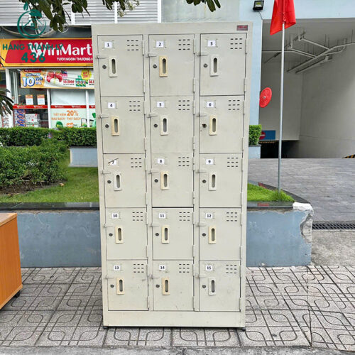 - Mô tả: Tủ locker sắt 15 ngăn cũ, thiết kế chắc chắn, lý tưởng để bảo quản đồ đạc cá nhân tại các văn phòng, công ty, hoặc trong các khu vực công cộng. Mỗi ngăn đều có khóa riêng biệt, giúp đảm bảo an toàn cho các vật dụng cá nhân. Tủ có màu sắc trung tính và được làm từ chất liệu sắt bền bỉ, dễ dàng vệ sinh và bảo quản. Đây là một sản phẩm tiết kiệm không gian và rất tiện lợi cho việc lưu trữ trong môi trường làm việc.