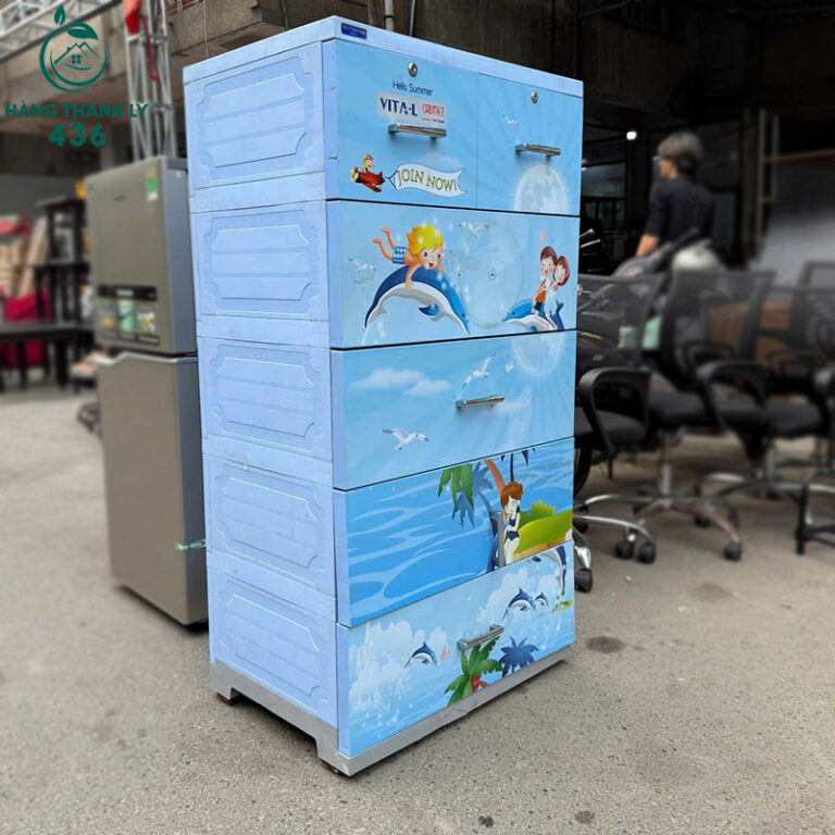 Mô Tả: Mẫu tủ nhựa ngăn kéo này phù hợp sử dụng cho phòng trẻ em, gia đình có bé nhỏ hoặc làm tủ đựng đồ cá nhân gọn gàng. Tủ thiết kế nhiều ngăn kéo giúp phân loại quần áo, đồ dùng học tập và vật dụng sinh hoạt cho bé dễ tìm, dễ cất. Họa tiết hoạt hình sinh động tạo cảm giác vui mắt, phù hợp với không gian phòng trẻ. Ngăn kéo trượt nhẹ, tay cầm dễ thao tác, chiều cao vừa tầm sử dụng. Tủ đã qua sử dụng nhưng còn mới, kết cấu chắc chắn, sử dụng ổn định lâu dài.