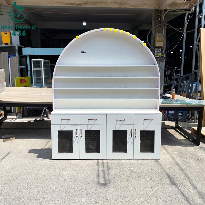 Mô Tả: Tủ trưng bày thiết kế dạng bán nguyệt phía trên giúp tạo điểm nhấn nổi bật cho không gian kinh doanh. Phần kệ nhiều tầng rộng rãi, dễ dàng sắp xếp sản phẩm như mỹ phẩm, bánh ngọt, đồ lưu niệm hoặc phụ kiện. Bên dưới là hệ tủ kín giúp cất giữ hàng hóa, vật dụng gọn gàng và tránh bụi bẩn. Chất liệu gỗ công nghiệp chắc chắn, bề mặt dễ lau chùi, phù hợp sử dụng lâu dài. Kích thước gọn gàng, dễ bố trí trong cửa hàng nhỏ, quầy bán hàng hoặc tiệm kinh doanh tại nhà.