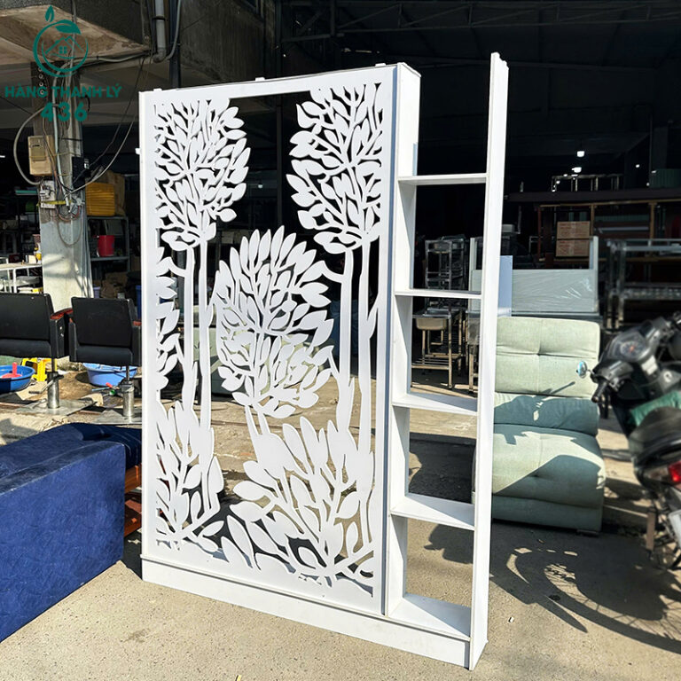 Mô Tả: Mẫu vách ngăn trang trí thiết kế hiện đại, họa tiết cây cắt CNC sắc nét, tạo điểm nhấn thẩm mỹ cho không gian sử dụng. Vách được kết hợp kệ bên hông, thuận tiện trưng bày đồ decor, chậu cây nhỏ hoặc vật dụng trang trí. Kết cấu chắc chắn, đứng vững, dễ đặt tại phòng khách, spa, salon hoặc khu vực trưng bày showroom. Tông màu trắng trang nhã giúp không gian sáng và dễ phối với nhiều phong cách nội thất khác nhau. Sản phẩm giúp phân chia không gian hiệu quả mà vẫn giữ được độ thoáng. Hàng đã qua sử dụng nhưng còn mới khoảng 90%, bề mặt sạch sẽ, sử dụng ổn định lâu dài.