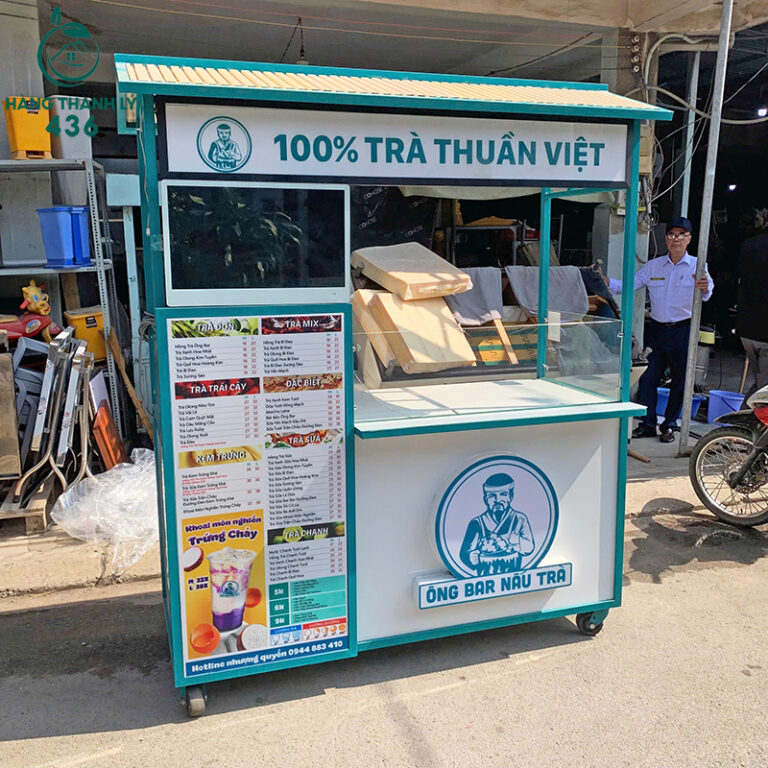 Mô Tả: Xe bán hàng được thiết kế khung sắt chắc chắn, có mái che giúp che nắng mưa khi kinh doanh ngoài trời. Bên trong có nhiều ngăn chứa đồ, tủ và ngăn kéo tiện lợi để sắp xếp dụng cụ pha chế gọn gàng. Xe được trang bị bánh xe giúp di chuyển dễ dàng đến nhiều vị trí khác nhau. Mặt bàn rộng rãi thuận tiện cho việc pha chế và trưng bày sản phẩm. Phù hợp cho kinh doanh trà sữa, trà chanh, nước giải khát hoặc đồ ăn vặt tại vỉa hè, trước nhà hoặc khu đông người.